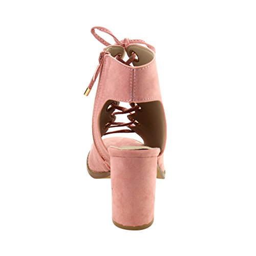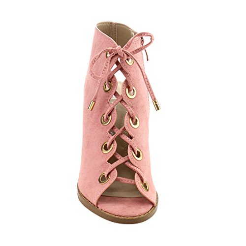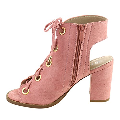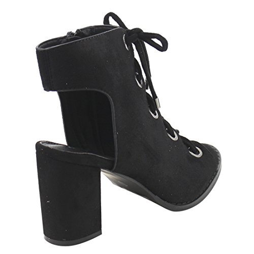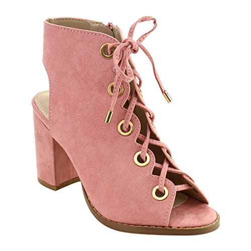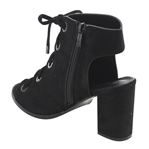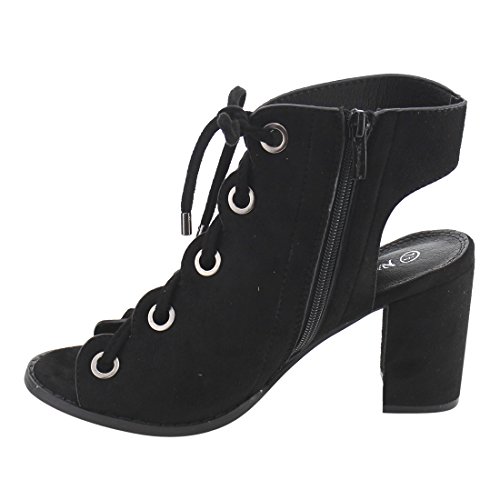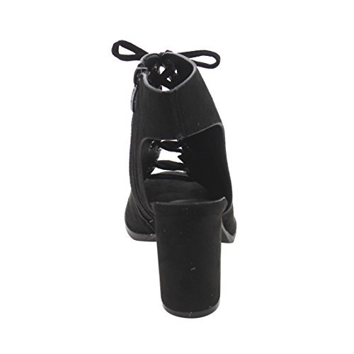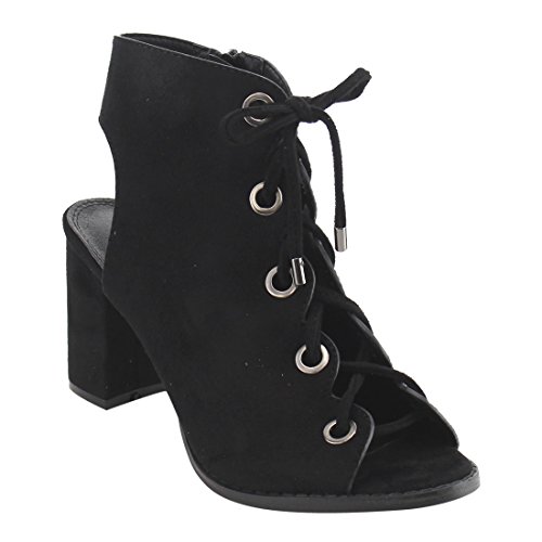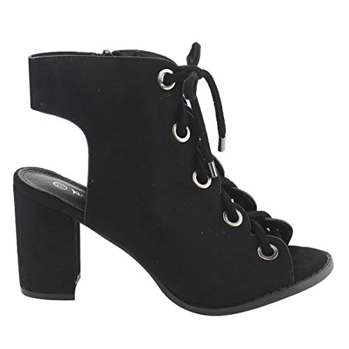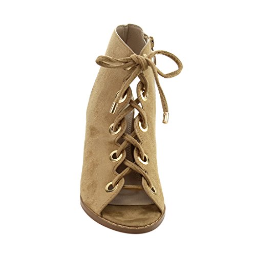 Product DescriptionDare to be noticed for your chic look in these heeled sandals. Featuring faux suede upper with gold-tone eyelet detail, lace up design, open heel and side zipper closure for easy on and off.0