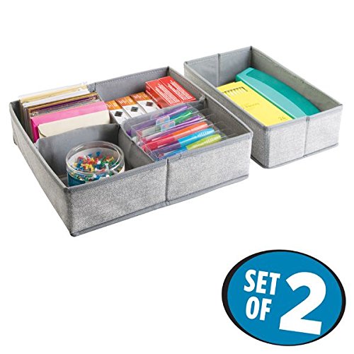 mDesign Fabric Desk Drawer Storage Organizer for Office Supplies, Notepads, Paper Clips, Pens, Three Hole Punch - Set of 2, 5 Compartments, Large, Gray