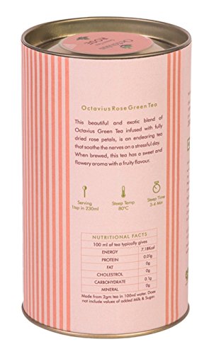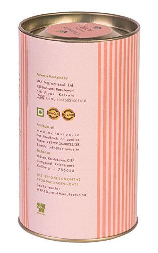 -. Binding : Grocery -. Brand : Octavius -. Feature : Octavius Rose Green Loose Leaf Tea in Premium Gift Cans / Sale For - 1 Can | Certified By - FSSAI / Brand - Octavius | Weight(Approx) - 100 Grams / This tea is a vibrant mixture of green tea leaves and scarlet rose petals of high fragrance producing a healthy brew not only rejuvenating the soul but skin also. / For buy more indian flavor tea varieties please click on "Octavius" under the title -. Label : Octavius -. Manufacturer : Octavius -. ProductGroup : Grocery -. ProductTypeName : GROCERY -. Publisher : Octavius -. Studio : Octavius -. Title : Octavius Rose Loose Leaf Green Tea in Premium Gift Can 3.5 Oz-FSSAI Certified