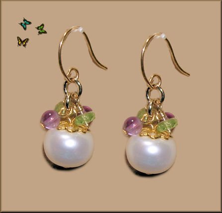 -. Feature : 18金イエローゴールド/国内産/YG18Kイエロ18金掛け式フック仕様(18k刻印あり) / 約4mmグリーンペリドット/    約3mmアメシスト、   約8mmx9mm大粒白淡水真珠 / 長さ:18mm / 揺れるように配したデザインのピアスです。 / シーンやシーズンを問わず活躍してくれそうです