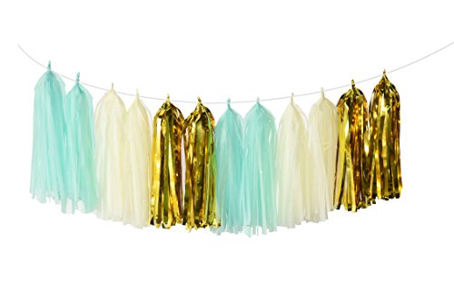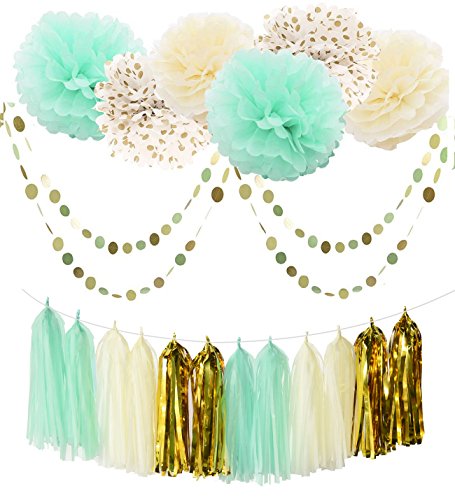 Pretty and popular mint gold cream tissue paper pom pom package,include 12pcs sheets in mint gold cream:4 pcs mint green;4 pcs cream;4 pcs gold; 6 pcs tissue pom poms: 2*mint(1*10inch+1*12inch); 2*cream(1*10inch+1*12inch); 2*polka dot gold(1*10inch+1*12inch);2 pcs dot circle grlands of mint cream glitter gold color of about 2 meters long each;