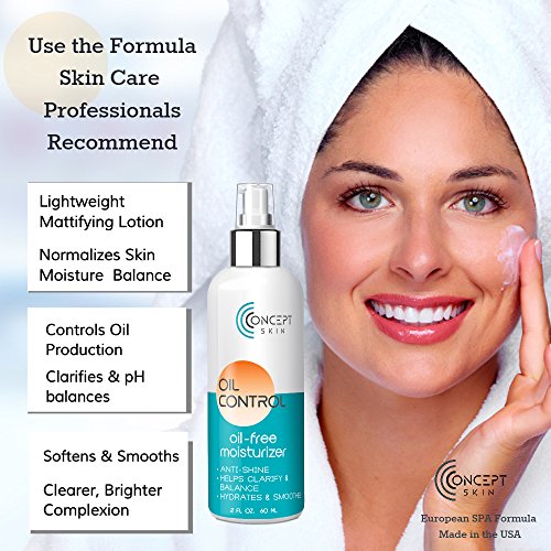 -. Feature : OIL FREE MOISTURIZER & BLEMISH TREATMENT IN ONE: For Oily Skin and Acne Prone Skin. A non-drying intensive acne fighting moisturizer made for everyday usage. Salicylic Acid combined with a power pack of Naturals Botanicals help to clear acne blemishes, control oil production, unclog pores and also helps prevent future breakouts. / OIL CONTROL & CLEAR COMPLEXION: The natural ingredients Cinnamon and peptides to help control oil production and soften and smooth the skin. The additional botanicals, Aloe, Tea Tree Oil, Lactic & Salicylic acid work exceptionally to help clarify and pH balance acne prone skin without dryness, irritation or redness for a clearer, brighter complexion. / MATTIFYING MOISTURIZER: A lightweight mattifying lotion with Lemon Peel Oil, Witch-Hazel and St. Johns Wort. These natural botanicals all work together to cleanse and normalize the skin's moisture balance. Guaranteed to leave your skin soft, smooth and shine-free. / QUALITY YOU CAN TRUST - This formula is used by Dermatologists, Spas and Estheticians alike, who use this effective formula for their clients with extraordinary results. Concept Skin products are made in an FDA registered Facility in the USA using only the finest natural and organic ingredients. / HOW TO GET CLEAR SKIN FASTER! - Concept Skin Naturals has a Complete Line of OIL CONTROL Oily Skin & Acne Treatment Products, and using them together can improve your overall results and appearance. Order Oil Control Moisturizer Now and Take Advantage of Concept Skin Naturals Special, Buy more than 1 Product and SAVE !!! Scroll Down page for Details