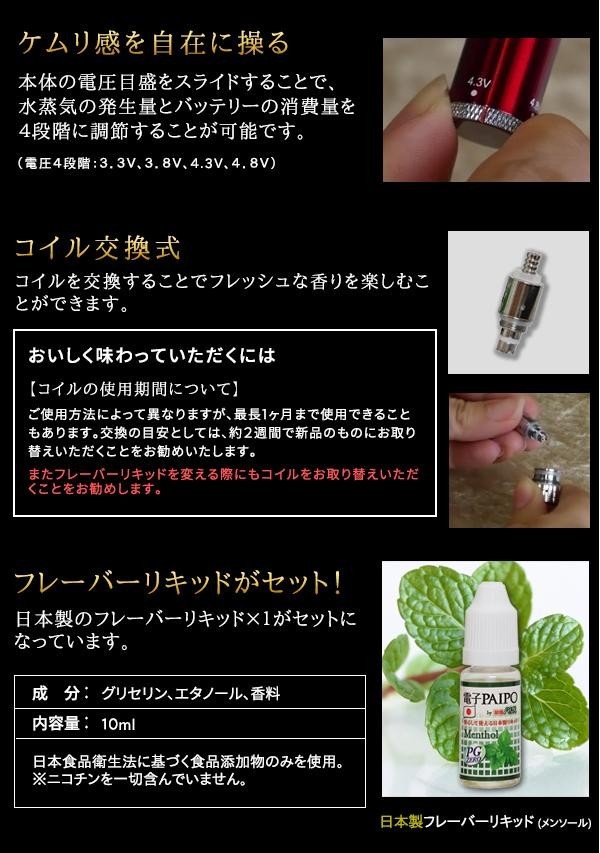 | セット内容 | 本体、USB充電ケーブル、交換用コイル、専用ケース、日本製フレーバーリキッド10ml(メンソール)、取扱説明書兼保証書(保証期間:6ヶ月) |