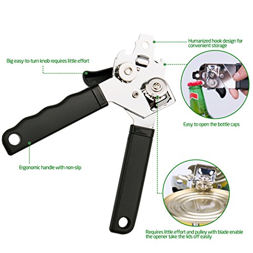 Can Opener, Ezire Tin Opener Built in Bottle Opener Heavy Duty Professional Stainless Steel Manual Can Opener Ergonomically Designed Handle and Easy to Turn Knob