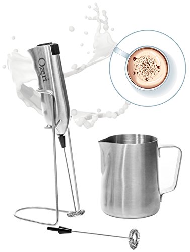 Studio : Ozeri Publisher : Ozeri Product Description The Ozeri Stainless Steel Milk Frother, Whisk and Frothing Pitcher Set provides everything needed to whip up and serve delicious and picture perfect frothy foam in as little as 10 seconds. Petite yet powerful, the Ozeri Milk Frother is perfect for steam-free cappuccinos, lattes, espressos, hot chocolates, shakes, frappes and other milky drinks. The Ozeri Frothing Set includes an elegant 12 oz (350 ml) Frothing Pitcher made of 304 high-quality Stainless Steel that features a forged pouring spout and sturdy handle. The powerful motor in the Ozeri Milk Frother spins at over 15,000 RPMs and activates instantly with results in 10 to 20 seconds. The Ozeri Milk Frother foams all kinds of milk (whole/regular/skim milk, soy milk, almond milk and coconut milk) alike for fluffy hot cafe lattes or cold chocolate malts in seconds. The Ozeri Stainless Steel Milk Frothing Set is made of food and drink-safe materials, and ships with the electric frother, stand, extra frothing attachment, pitcher and 2 AA batteries. Your satisfaction is guaranteed. 0