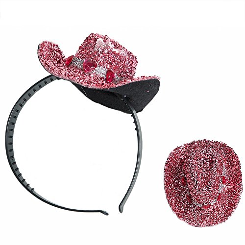 -. Feature : 1 fascinator per package. / One size fits most, approximately 13 1/2 ″ around the inside of the headband. / Pink cowboy hat is approximately 5″. / Plastic headband has teeth for a secure hold. / Silver hat band with heart gems.