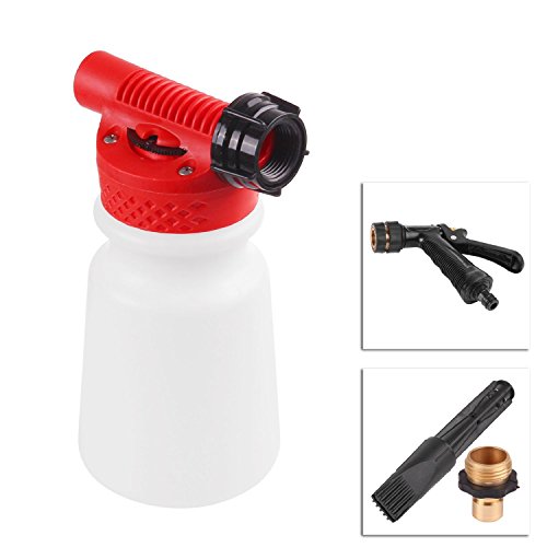 -. Feature : Unique foam cleaning gun, large 900ml capacity, works with most garden hose. / Capacity: 900ml container bottle; 2 in 1 function, support to spray foam or spray water. can creates a thick, clinging foam. / Fully Adjustable dilution with setting dial, adjustable Spray Nozzle for accurate mixing and foam generation. / Hand grip with quick connector, easy to install. Detachable design, easy to carry and storage. It can work with regular hose end. You don't need a pressure washer. Adapters for different type of hose are included in the box. / Multiple use: car, motorcycle washing, windows washing, Driveways, Roofs, Siding washing.