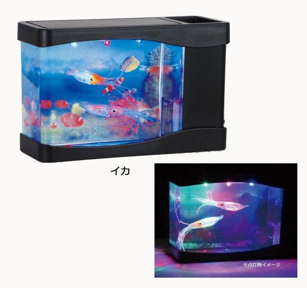 | クマノミやイカの模型が水中で浮遊します。LEDライトを点灯させると幻想的な雰囲気になります。お部屋で小さなアクアリウムをお楽しみください。家庭用コンセントまたは単3乾電池×3本どちらでもご使用いただけます。 |
