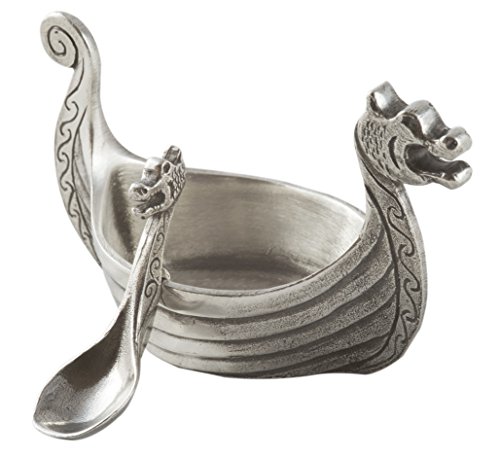 [Product Information]- Pewter Salt Cellar - Vikingskipene Pewter Viking Ship Salt Cellar Set. 3.5" long X 2.25" high. Includes a small pewter spoon to dip salt out.