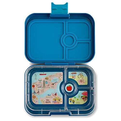 Perfect for kids and adults! 4 compartments (total volume 3 cups plus dip): One 2 cup portion for sandwich/salads, Two 1/2 cup sides, One 1 oz dip/treat well. Illustrated "NYC" Tray.