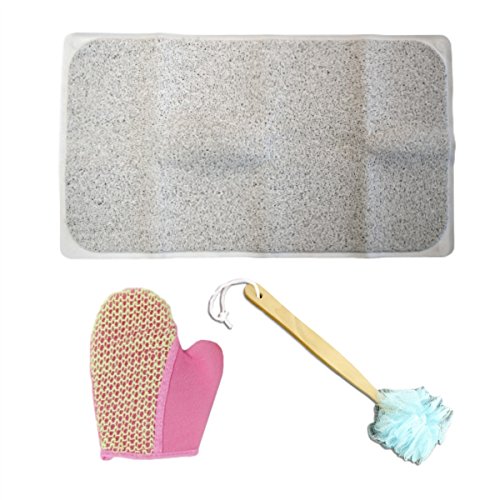 FLASH SALE Bathroom 3-in-1 Pampering Set - Exfoliating Mitt, Puff on a Stick, and Non-Slip Shower Mat