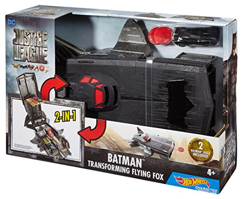 -. Feature : Transport the entire Justice League in the latest Batmanvehicle, the Flying Fox from the new Justice League movie. / This new vehicle can transport up to 6 Character Cars, fires discs while in flight mode, and transforms into a mobile base for 2-in-1-action play! / Use your Batman Character Car to take the Flying Fox on missions. Once you have landed the Flying Fox, open the vehicle up to reveal the Justice League base of operations in the interior of the ship. / There's an elevator that goes to three distinct levels and can be used as a side-by-side race ramp when track is connected / There are four other track connection points that can be accessed by lowering the ramps positioned around the base of the ship, as well as two secret escape hatches located in the rear for quick getaways
