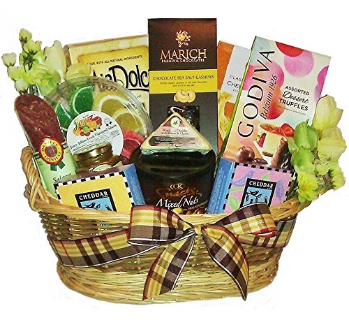 -. Feature : An all occasion gourmet snack and sweets basket. / Featuring gourmet cheese, salami, deluxe nuts, chocolate truffles and tasty snacks. / Presented in a wicker basket decorated and tied with ribbon. / Perfect for Birthdays, Get Well, Easter or any time you want to express your thoughts and wishes.