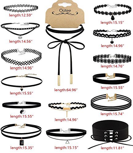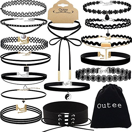 Choker Set, Outee 15 PCS Womens Choker Necklace Set Black Velvet Lace Tattoo Choker Set Girls Stretch Necklace