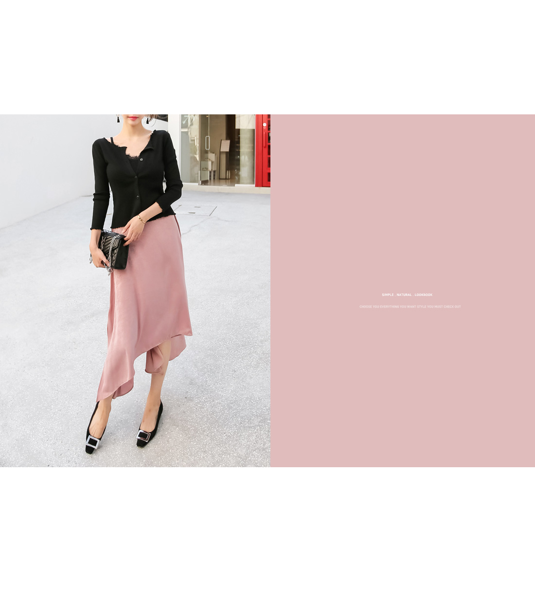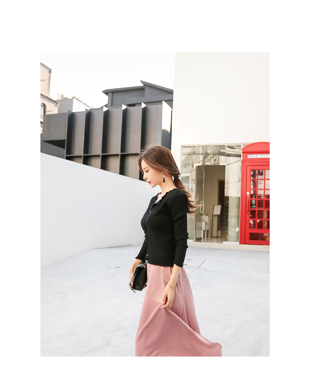 사이드 부분에 지퍼 디테일로 오픈, 클로징을 도와주며 감각적인 트임 디테일이 더해져 트랜디한 무드를 더했어요.