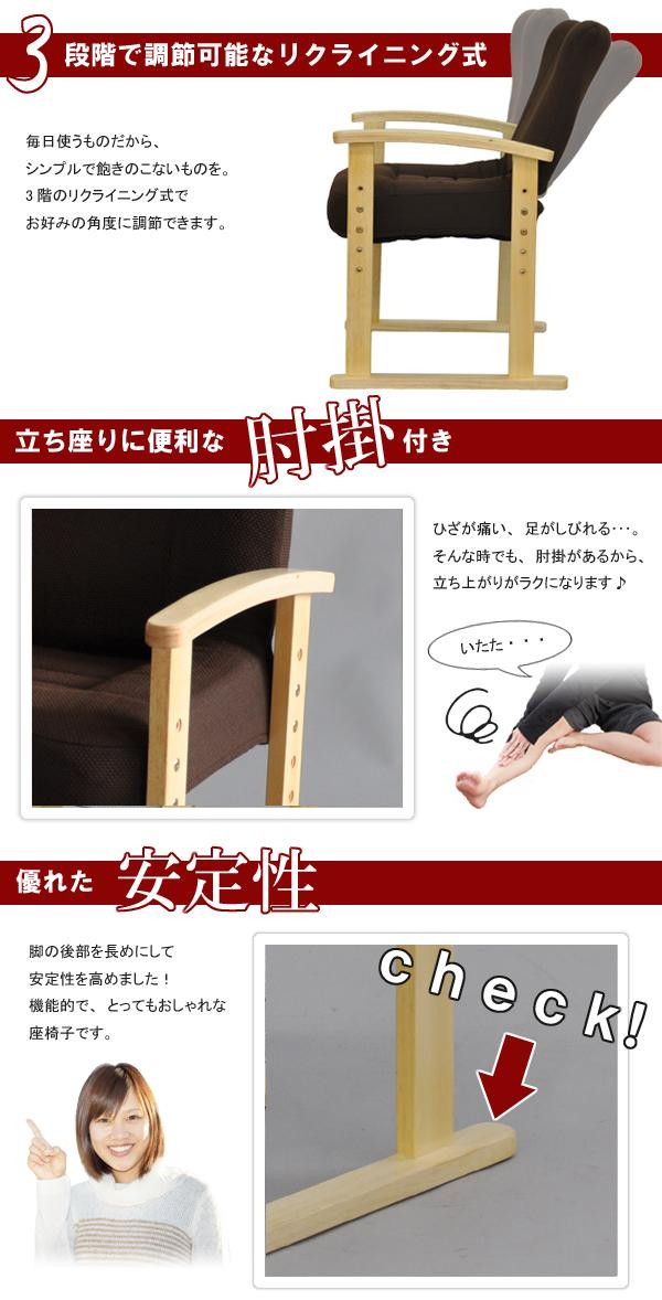 立ち座りに便利な肘掛付き。脚の後部を長めにして安定性を高めました。 |