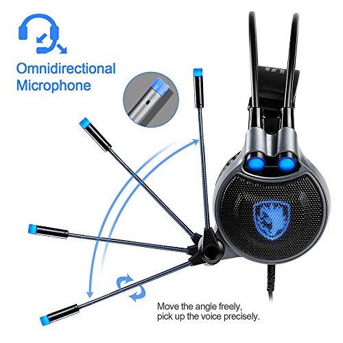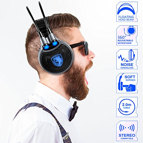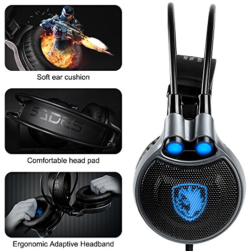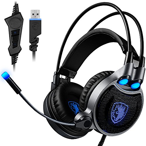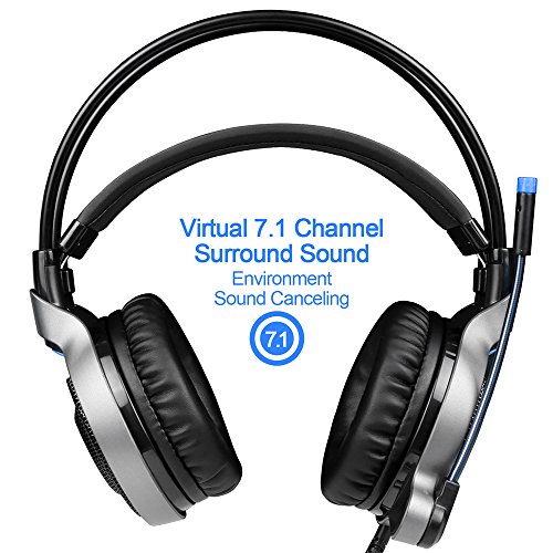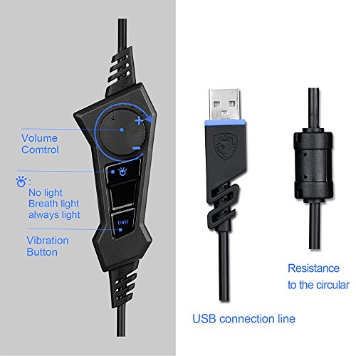 USB Gaming Headset for PC Laptop Mac, SADES R1 7.1 Virtual Surround Sound Stereo Wired Headphone with Microphone In-line Control by AFUNTA - Black + Blue