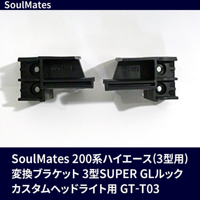 | 「SoulMates 200系ハイエース(1・2型用) カスタム用ヘッドライト 3型SUPER GLルック(品番GT-T01、GT-T02)」を、3型の単筒タイプヘッドライトから、ドレスアップに使う場合に使用するステーです。3型同士および4型→3型への交換需要に対応します。 |