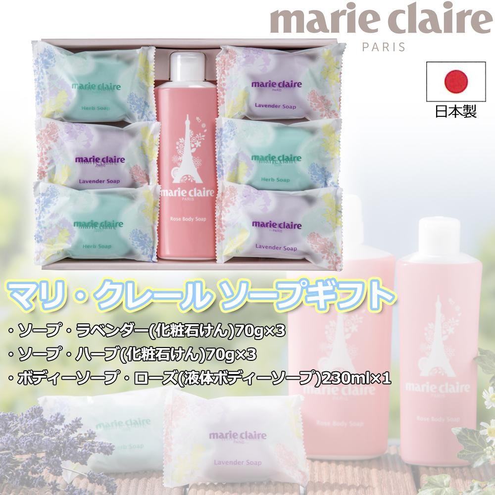 | セット内容 | ソープ・ラベンダー(化粧石けん)70g×3 ソープ・ハーブ(化粧石けん)70g×3 ボディソープ・ローズ(液体ボディソープ)230ml×1 取扱説明書 |