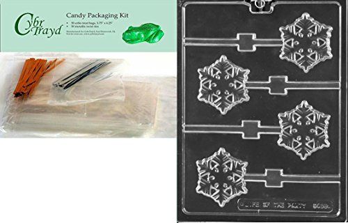 CybrTrayd C468 Frozen Snowflake Lolly Chocolate Candy Mold with 50 4.5-Inch Lollipop Sticks, Clear