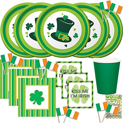 -. Title : St Patricks Day Party Plates Party Supplies Set Shamrock Kiss Me I'm Irish Kit Top Hat Premium Paper Lunch or Dessert Plates Napkins Cups Irish Flag Picks Recipe Set Serves 16 (209 Pieces)