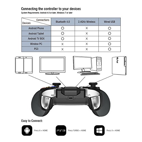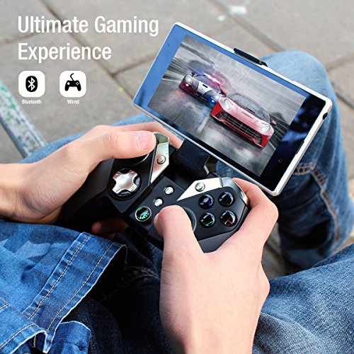 -. Feature : ✔ Compatible with Android 4.0 and up devices, such as smartphone, tablets, smart TV, as well as the Samsung Gear VR and other android OS VR, support thousands of controller-enable games. Connections: Bluetooth 4.0 / ✔ Ergonomic, and attractive design with top-toughened materials, brief and smooth streamline, it feels firmly, and comfortable to your palm with the texturing in the surface. The layout of the buttons is so humanized as to operate fluently and efficiently. / ✔ Portable built-in bracket with two adjustable angles (110 degrees & 150 degrees), can be used as an individual mobile holder for 3.5~6-inch smart phones. / ✔ Analogue sticks have 360-degree positioning with ultra-accuracy and almost no handle dead-zone. The button life is more than 2 million times. The trigger adopts of metallic design, with dazzling shape, avoid slippery when sweating. Firm bumpers and responsive pressure triggers allow you perform great in car racing and drifting games. / ✔ Changeable position of D-pad & the left joysticks, Play the games in the way you like. Adjustable vibration intensity allows you to have a real feedback in different scenes of games.Chargeable battery can last 10 hours for Max Power while 30 hours for Min Power, stand-by time can last at least 12 months.