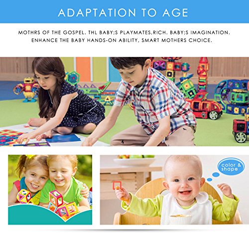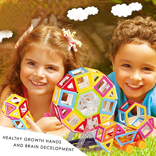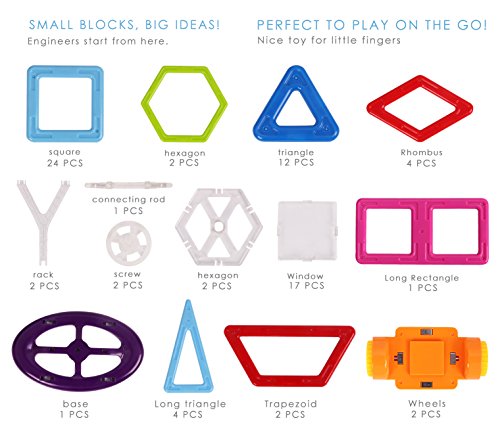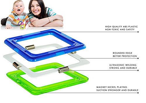 -. Feature : 【SAFE MATERIAL】: The Magnetic Building Blocks is made from non-toxic, High quality abs plastic conform to CE, ASTM, H.R.4040 and EN71.Smooth edge of each tile will never hurt baby's little hands. / 【UNLIMITED FUN】: 76PCS magnetic blocks toy set which comes in a beautiful variety of magnetic tiles colors that appeal to boys and girls of all ages, can be combined into Many patterns, such as: House, plane, Train, cat, fish, ball and more. / 【MULTI-COMBINATION】: Totally 76pcs including 24*Square, 12*Triangular, 4*Long Triangle, 4*Rhombus, 2*Hexagon, 2*Trapezoidal, 2*Wheels, 1*Long Rectangle, 17*Card Windows, 8* wheel parts, 2 letter cards on each side of each magnetic tile. / 【DEVELOP SKILLS】: These magnetic toys Unique shape, free combination, Could develop children's fine motor development, cognitive development of color, teamwork ability, artistic cognitive, sensory, cognitive ability, practical ability, imagination and creativity. Best Educational stacking Blocks kits for your boys and girls. / 【CUSTOMER GUARANTEE】: We're SO confident that you kids will love this magnets building blocks set that it's backed by our 100% Money Back Guarantee. If you child don't love it for whatever reason, we'll replace it or give you every cent back. That means that you either love it, or it's free!