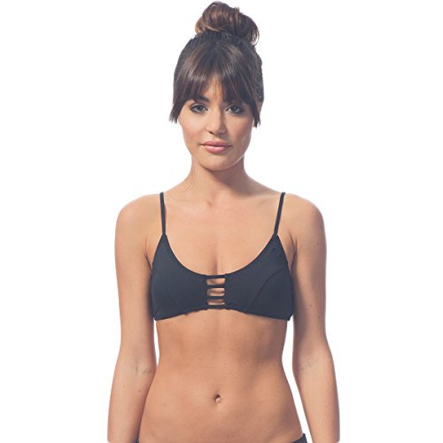 Bralette silhouette with strapping detail at center front, front stitch detail, and over-the- shoulder straps.