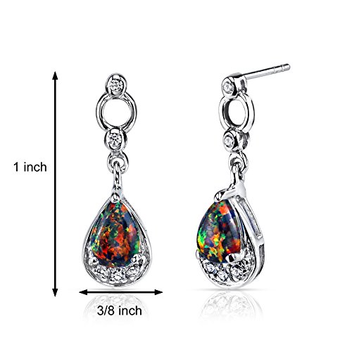 Featured Stones: 2 pieces Blazing Black Created Opal, teardrop-shaped cabochons sized at 7x5mm each, 0.75 Carats Total Weight; Accent Stones: 10 pcs White Cubic Zirconia; Earrings: 2.3 grams Sterling Silver with .925 Stamp. Earrings are Measures 1 inch height and 3/8 inch width. Earring backs are push-back style. Blazing Black Timeless Teardrop Created Opal Sterling Silver Dangling Earrings pays homage to vintage classic style. The stone?s stunning iridescence, cushioned in fine sterling silver with CZ inlay gives you a flawless, polished look. The Opal is Octobers birthstone and would make a perfect gift for the October birthday girl. Its also a wonderful gift for just about any occasion such as Mothers Day, Valentines Day, Graduation, Christmas, and Anniversaries. This is also an ideal gift for bridesmaids, flower girls, and other members of your wedding party. The earrings showcase an exquisite design with outstanding craftsmanship, and boast a no-tarnish Rhodium finish. Signature gift box included with purchase. Style SE8452.Feature