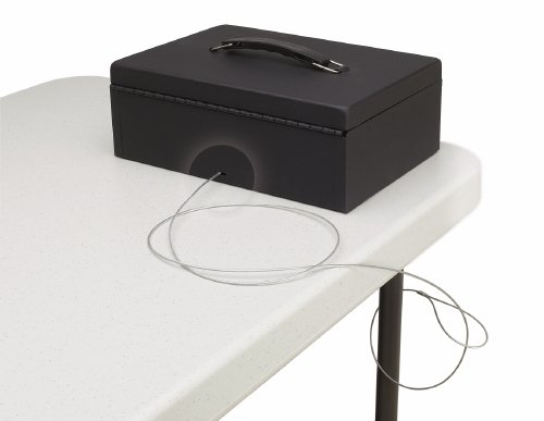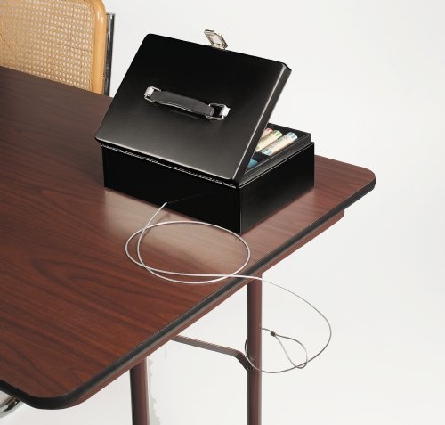 - Feature : Cable secures cash box to tables, desks and other items. / Ideal for outdoor activities such as garage sales, craft fairs, sporting events / Latch holds cover closed in locked or unlocked position. Handle makes transporting easy. / Features durable steel construction / Comes with removable seven-compartment, plastic cash tray