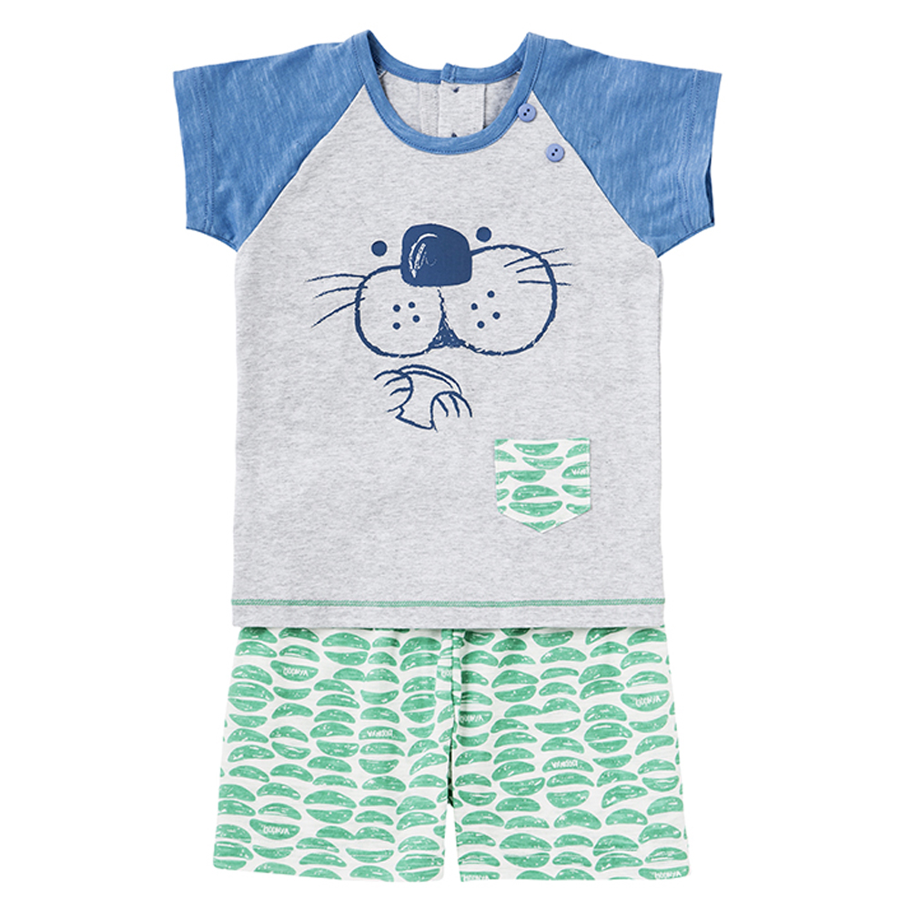 외의로 활용 가능한 아이템으로, 멜란과 블루, 그린 컬러 조합으로 구성된 제품입니다.상의 앞몸판에는 도토리를 먹는 두더지의 이미지를 심플하게 구성, 하의와 상의 하단에는 바나나 모티브로 구성한 감각적인 필나염을 매치하였습니다.