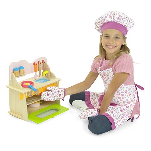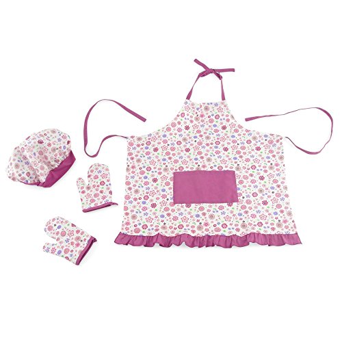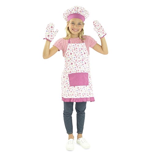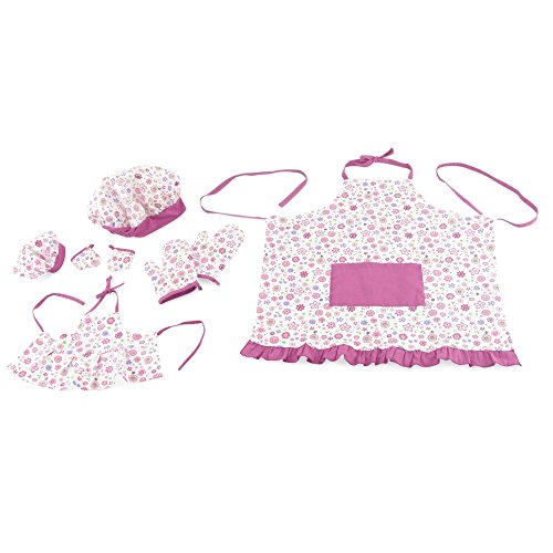 - Also includes two matching floral oven or pot holder mitts and saucy chef hat for both doll and girl.