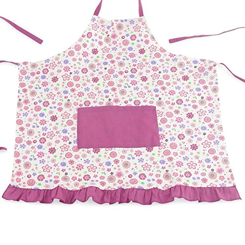 - Includes vibrant pink floral pattern doll apron with dark pink trim, and matching girl apron.
