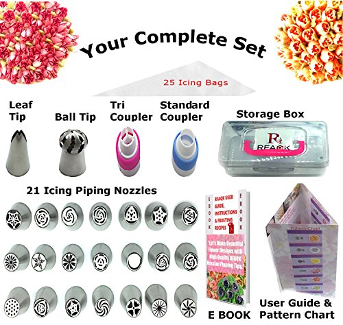 50 Pcs Russian Piping Tips Set with Storage Case- 21 Numbered,Easy to Use Icing Nozzles,Pattern Chart,E.Book User Guide,Leaf & Ball Tip,2 Couplers,25 Bags.Extra Large cake, cupcake decorating Kit