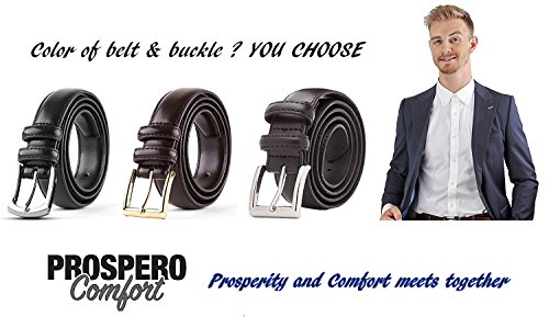 -. Feature : 3 COLORS & "15 AVAILABLE SIZES" TO CHOOSE FROM: Color 1) Black belt with silver finish feature-edge buckle, Color 2) Brown belt with golden finish buckle, Color 3) Brown belt with silver nickel buckle - Prospero Comfort belts are available from size 32 to size 60, to include regular men's sizes plus big & tall sizes, in that way every men can find their correct size. / "MAKE SURE TO ORDER 1 SIZE BIGGER THAN YOUR PANTS SIZE" as a rule of thumb your belt size needs to be approx. 2 inches bigger than your actual waist/pants size, so measure your waist and choose the right belt for you, we have also attached a size chart with clear instructions - Belt Strap width dimensions is around 1.2 inches / PROSPERITY & COMFORT MEETS TOGETHER: the black and the brown colors "Prospero Comfort" belts are constructed from high quality genuine leather, which ensures the quality and durability of the belt, for a longer endurance and better upholding. / "Prospero Comfort" genuine leather belts features a classic smooth finish and beautiful stitching on top & bottom, a double loop to hold end of strap, a single prong buckle, so it goes great with dress uniform, or formal wear to be worn for everyday use, and for any casual occasions, the variety to choose makes the "Prospero Comfort" Belts complement with any outfit to give you a sophisticated look and feel. / ORDER WITH COMFORT. Prospero Comfort exchange policy enables you to purchase without hesitation! 100% satisfaction guaranteed, 30 days' free exchange and return policy, so don't delay just add the Prospero Comfort Men's Classic Stitched Belt to cart and enjoy your purchase!