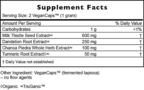 Liver Rescue contains beneficial levels of the most powerful liver herbs known: milk thistle, dandelion root, chanca piedra, and turmeric. The herbs in Liver Rescue work together synergistically to support liver function detoxification. No fillers, binders, flow agents. Liver Rescue is vegan, kosher, and gluten-free. TruGanic Purity: Free of pesticides, GMOs, and irradiation; verified by actual testing. Lab tested for botanical identity, heavy metals, and microbiological activity. Available in VeganCaps. EcoFresh packaging delivers superior freshness. Manufactured in U.S. vegan facility free of gluten, peanuts, and tree nuts.Feature