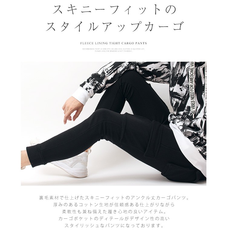 裏毛タイトカーゴパンツスリムシルエットのアンクル丈カーゴパンツ。厚手の裏毛素材を使用しておりスタイル良く履けるデザイン性の高いアイテム。柔軟性もあるので履き心地も良く仕上がりの良いパンツです。トレンドのアンクル丈も足元をスッキリと見せる効果もあり雰囲気良く着こなしていただけます。◆サイズ(ウエスト/股上/わたり幅/股下/裾幅)※cm:【M】76-84/28/24/65/12【L】84-94/30/26/68/13◆モデル情報:身長:176cm / 体重:58kg / 着用サイズ:M◆素材:本体 ポリエステル65% 綿35% リブ部分 ポリエステル62% 綿34% ポリウレタン4%◆カラー展開:ブラック(1)ANTENNAMENS アンテナメンズ