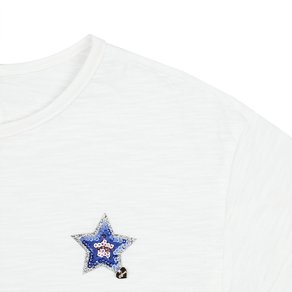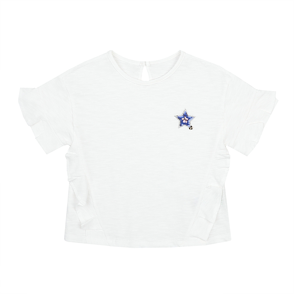 색상-아이보리사이즈-110,120,130,145,155,165상세설명-사랑스러운 프릴디테일이 포인트인 드롭숄더 티셔츠로 가슴에 블링한 별스팽글자수가되어있는 티셔츠.