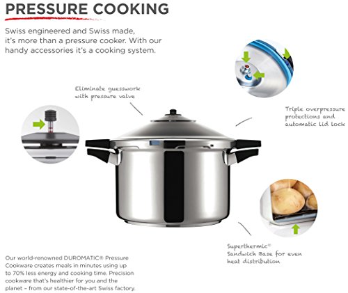7-3/8-quart saucepan-style pressure cooker made of 18/10 stainless steel; holds up to 4 pint or 3 quart jars for canning