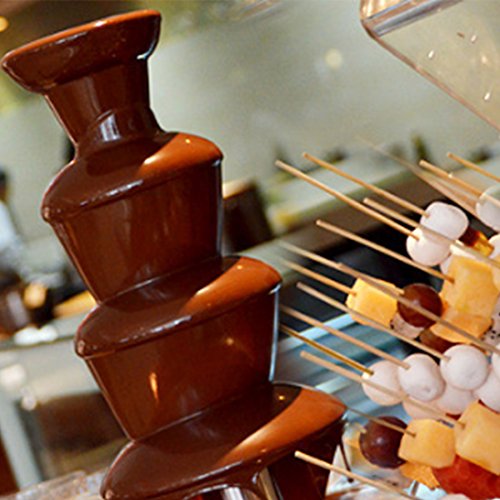 Note: To make the melting process faster and to prevent blockage of the fountain, please use chocolate of high percentage of cocoa butter, or you can melt the chocolate first with a microwave oven. Besides, chocolate syrup is also a good choice.Package Includes: 1x Chocolate fountain machine