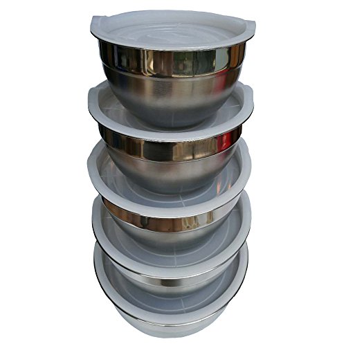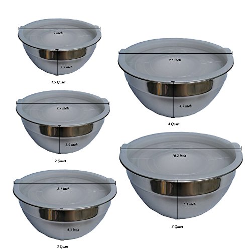 - MIXING BOWLS WITH LIDS These sturdy and attractive mixing bowls with clear lids keep your food material fresh in the refrigerator storage. The set comes with 5 Qt, 4 Qt, 3 Qt, 2 Qt and 1.5 Qt bowls and lids.