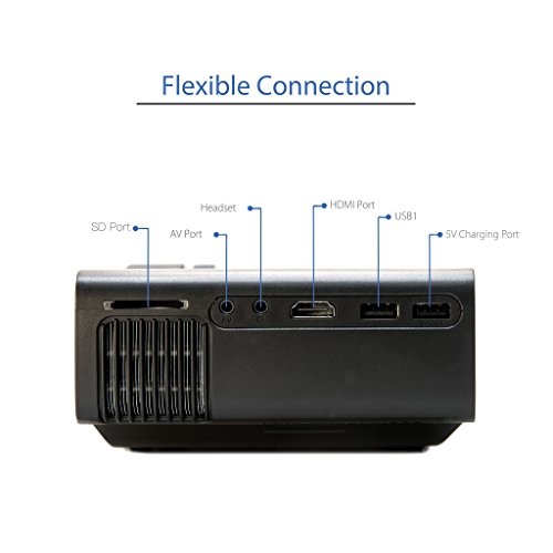 2. Perfect Collection----The Portable Projector has HDMI, AV, TV, USB, SD card slot, 3.5mm headphone interface. HDMI input can be connect with PC/DVD/VCD/ PS3/ X box/ TV box . AV/TV can be connect with TV and video device. USB interface can be connect with your USB stick.