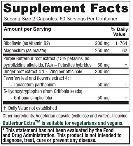 [Product Information]- Butterbur Extra™ contains petasins derived from butterbur root as well as other scientifically studied ingredients supporting healthy blood vessel tone, healthy brain chemistry and normal blood flow in the brain.*