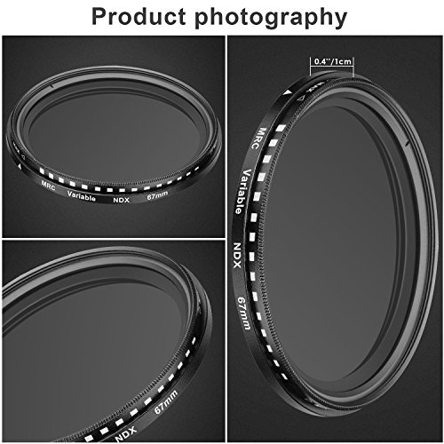 Description: Adjustable ND2-ND400 Fader Neutral Density Filter: Compatible with the Canon EOS 80D Digital SLR Kit with EF-S 18-135MM, Canon Rebel (T6i T6 T5i T5 T4i T3i T2i), EOS (700D 650D 600D 550D 70D 60D 7D) DSLR Cameras with the 18-135MM EF-S IS STM zoom lens Made of HD optical glass, which can increase light transmission without dark corners. Aluminum alloy frame sealing ring makes it have which can avoid falling or loosing. By rotating the end of the lens you are able to control the amount of light (between 1-8 stops) that enters the lens Allows the use of slow shutter speeds, with high speed films or digital cameras, to record movement image blur in subjects such as waterfalls, clouds or any fast moving subject Reduces the amount of light reaching the film without affecting the color Decreases the depth of field by using wider apertures; Helps separate subjects from their background Protects your lens from dust and scratches and always keep your lens clean Special front lens can avoid vignetting at wide angle lens. The diameter of the front lens is larger than that of the rear lens Specification: Weight: 0.9 ounce / 25 grams Material: HD Optical Glass; Aluminum Alloy Frame Package Content: 1 x 67MM Slim ND2-400 Filter 0