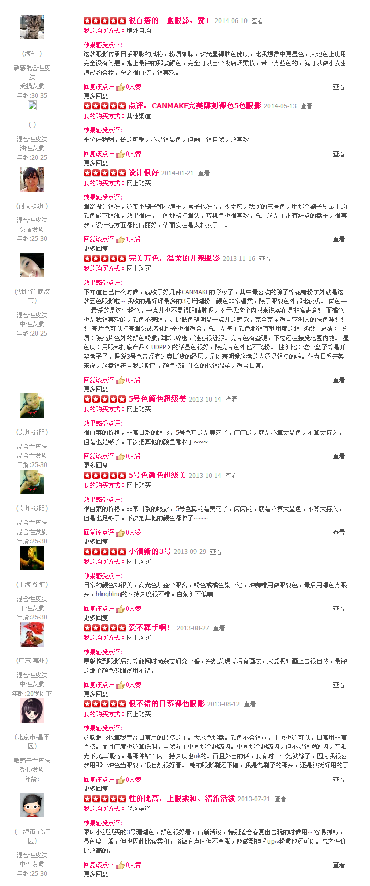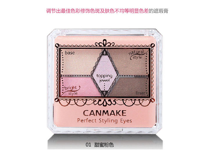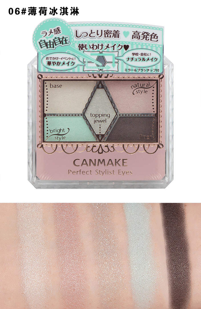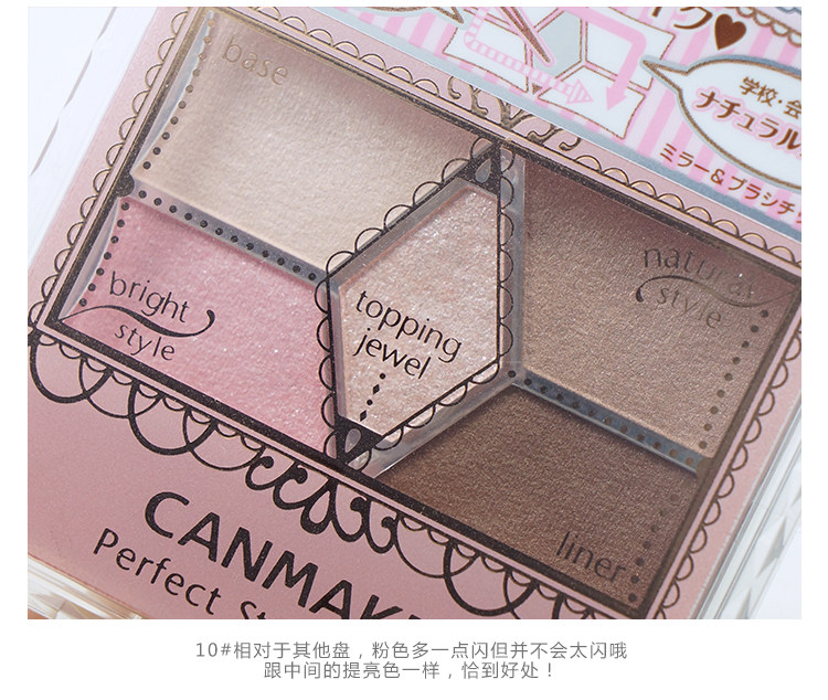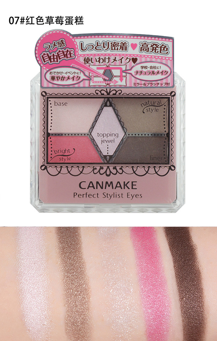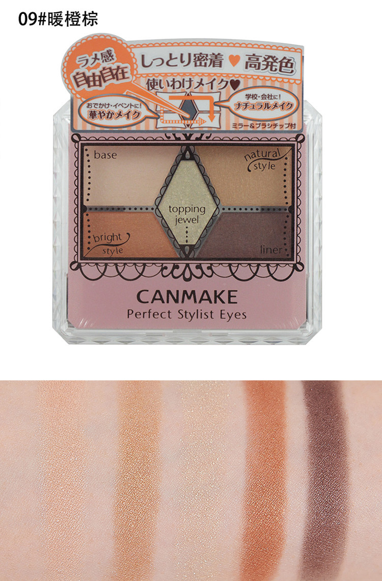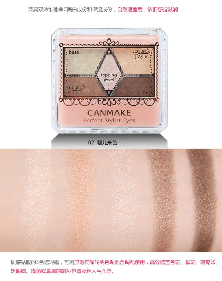 |  主要功效: CANMAKE完美眼影盒,含珠光微闪哦!五色组合,内含一个眼影棒5色选,绝非秋冬季的浓厚色,而是更轻 盈、更亮泽。 只需一盒,既可以化出上班或上学的自然通勤眼妆,又可以打造华丽感的上街妆容 产品色号 2号 婴儿米色系:最实用的裸色大地色,新手随便化也不会出错 3号 珊瑚粉色系:小腻腻强烈推荐03号,超漂亮的颜色哦 4号 珊瑚粉棕色:新色,秋冬华丽新色,成熟御姐范儿 5号 淡雅米棕色:限定色 偏粉的裸棕色,温柔优雅气质,和其他几色不同,左上角的打底色是哑光的粉质 6号 薄荷冰淇淋:清新奶绿色(13年上市新色):那一抹超耀眼的薄荷绿,给简单的眼妆带来 7号 玫红粉色系:玫红的青春靓丽撞上粉红色的咔哇依,换一种调调,萌妹子也要活泼起来了! 8号 蓝色米棕系:蓝色眼影会让女生看起来青春俏皮,又不会给人带来压力,首选首选!! 10号 新色暖粉棕 11号 新色金粉棕 ------------------------------------------------------------------------------------------------------------------- 使用方法: 用手指沾取左下涂抹在眼部上方,用稍微扁头的刷子沾取右下涂在上眼皮的尾部。然后用稍微尖头的刷子沾 取上右勾勒整个眼部曲线,最后用小刷子沾取上左扫在眼头。 |