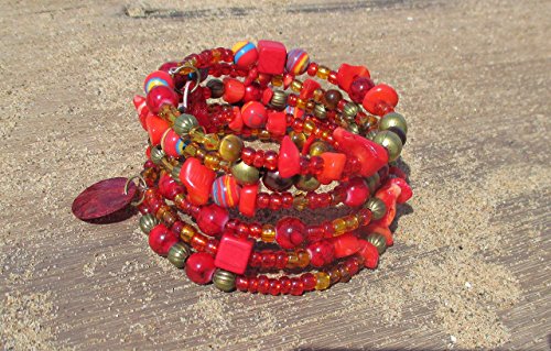 -. Title : Red gemstone beaded memory wire wrap bracelet with turquoise and coral stones