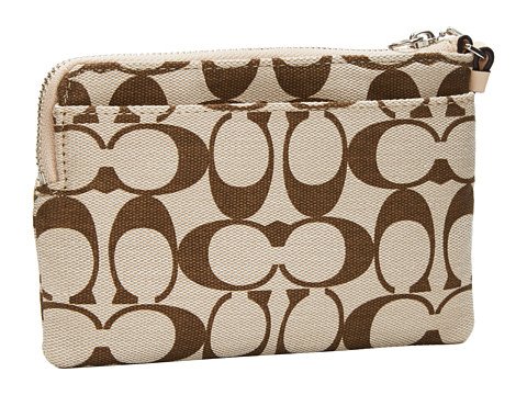 -. Feature : wallet / Signature fabric with leather trim / Two credit card pockets Zip-top closure, fabric lining / Strap with clip to form a wrist strap or attach to the inside of a bag / 6 1/4 (L) x 4" (H)