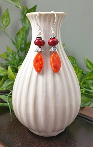 -. Title : 1 Pair of Dew Drops Earrings in Tangerine Orange Ruby Red and Sterling Silver Lampwork Glass