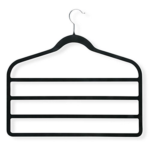 -. Feature : 4-Tier Black Velvet Touch Pant hanger, flocked hanger / Delicate Black velvet touch material / Chrome plated hook / Holds 4 pair of pants / Home organization made easy!