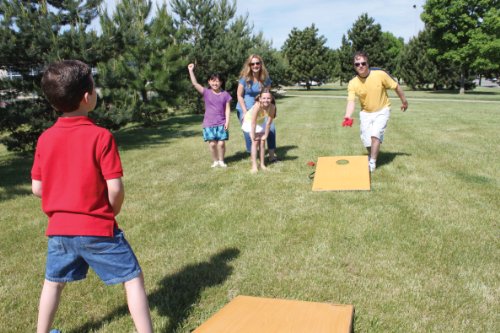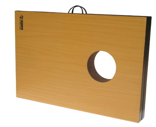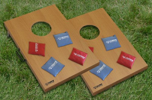 - Feature : Sturdy, compact bag toss game can be taken along on any outdoor adventure for hours of fun / Ideal for backyard BBQs, camping trips, tailgating at the big game, and more / Two 35"L x 24"W x 1.5"H large game platforms with steel fold-out legs / Includes all game pieces needed: eight 6" square toss bags (four red and four blue) / Boards lock together for transit with convenient carry handle.